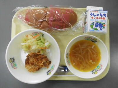 牛乳 黒パン チキンこんがり焼き 白菜とコーンのサラダ ジュリエンヌスープ