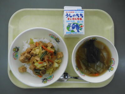 牛乳 厚揚げの豚みそ丼 玄米だんご汁