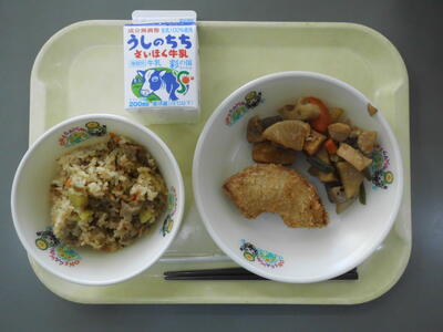 牛乳 豚肉とさつまいもの炊き込みごはん お麩のカツ べっこうに