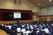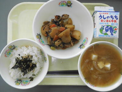 牛乳 発芽玄米ごはん ひじきとじゃがいものにもの みそ汁 キンムチム(韓国風のりふりかけ)