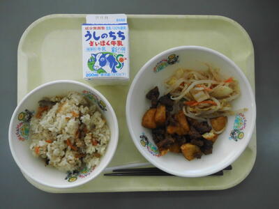 牛乳 かやくごはん レバーとじゃがいものバーベキューソース ごますあえ