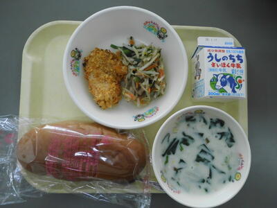 牛乳 黒パン チキンのカレーマヨ焼き もやしの炒め物 長ネギのクリームスープ
