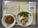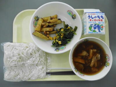 牛乳 なめこおろしうどん 大豆入り大学芋 小松菜とわかめのサラダ