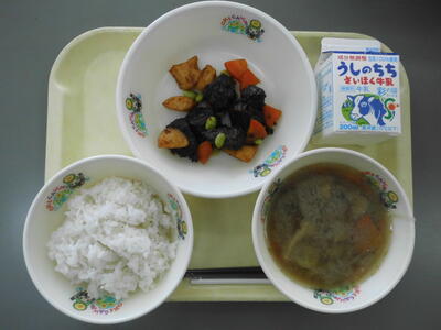 牛乳 ごはん くじらのカラフル炒め 野菜のかす汁