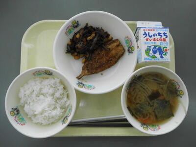 牛乳 ごはん いわしのかば焼き ひじきと大豆の煮もの どさんこ汁