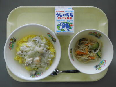 牛乳 クリームソース ターメリックライス もやしのサラダ