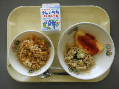 牛乳 コーンピラフ オムレツトマトソースかけ ビーフンペペロンチーノ