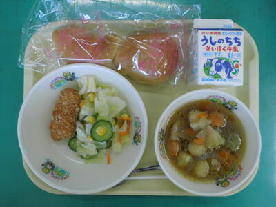 牛乳 ツイストパン チキンポテトフライ フレンチサラダ 彩り野菜スープ